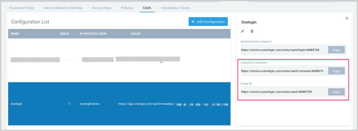 Classic UI. In the main Sumo Logic menu, select Administration > Security > SAML. - Click + Add Configuration to create a new configuration.