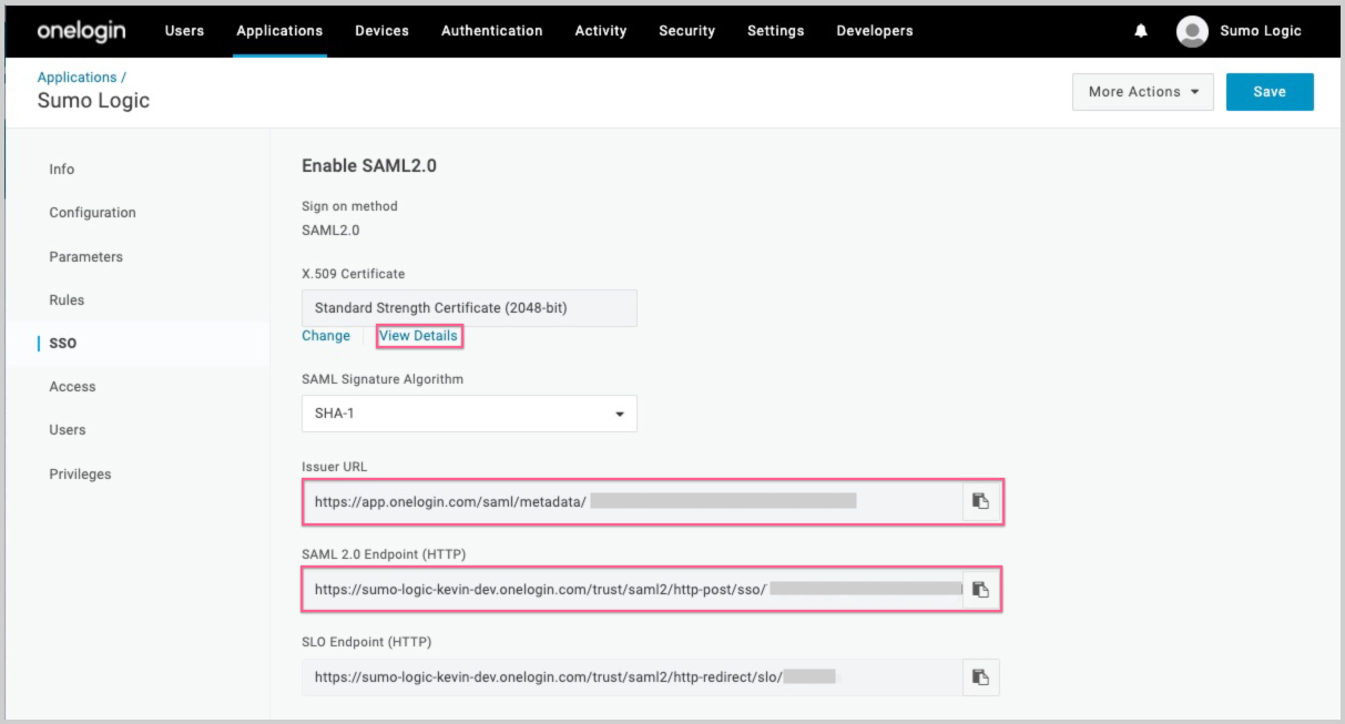 - Copy the Issuer URL and the SAML 2.0 Endpoint to supply when you configure Sumo Logic in Step 2 below.