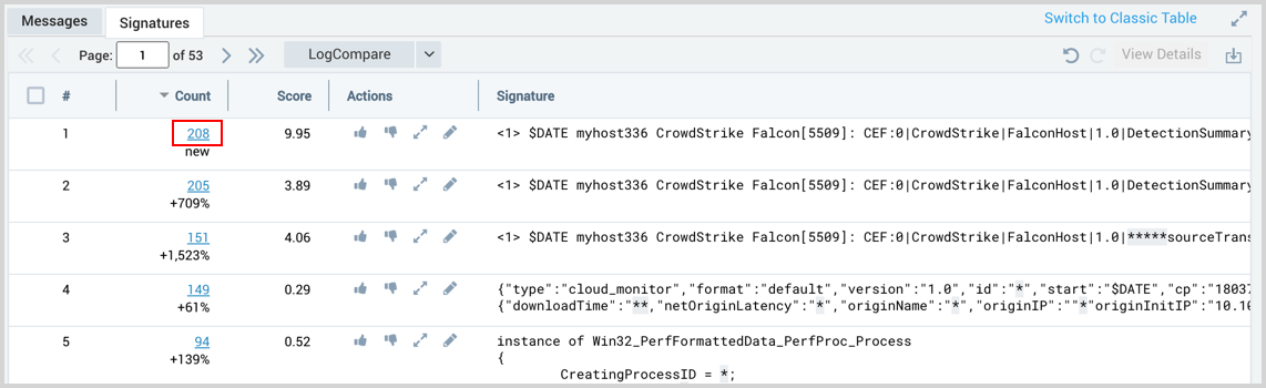 Logs are clustered into patterns, called signatures. The structure of logs is analyzed for patterns and assigned a unique identifier. You can search for logs that have a specific signature by clicking the number value in the Count column. See the Details option for details.