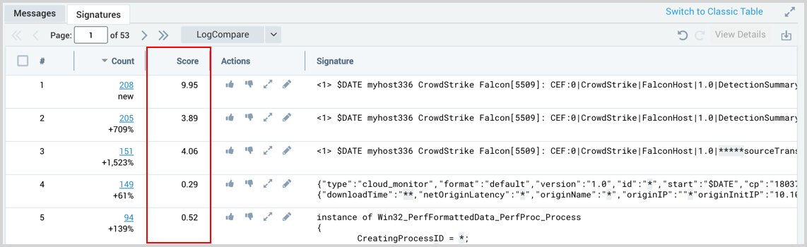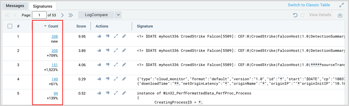 After running a query with LogCompare your results are displayed in the Signatures tab of the Search page. You will have a table with Count, Score, Actions, and Signature columns.