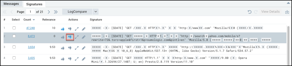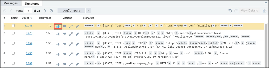 - Promote a signature by clicking the Thumbs-Up icon for a signature to indicate to Sumo Logic that the data included in the signature is relevant to you. This feedback is taken into consideration when you run LogReduce the next time.