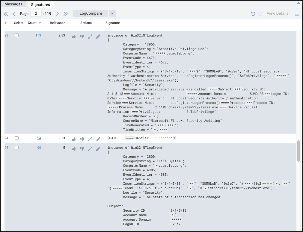 In some cases, this data sampling produces results that do not meet the needs of your organization. You can see more granular results by splitting a signature. In addition, you can promote or demote a signature to help Sumo Logic understand what data is the most relevant to you.