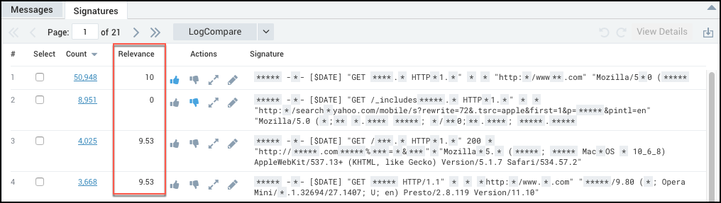 The LogReduce® Relevance column displays a numerical score for a signature, predicting which signatures could be most meaningful to a user. The Relevance value is computed using your history of feedback (Thumbs Up and Thumbs Down) and the instances when you’ve chosen to view the details of signatures.