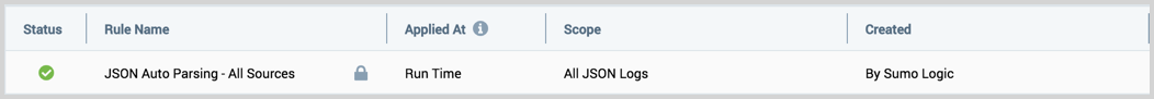 By default, your account is configured with a Run Time FER that is applied to all of your data. The default Run Time FER, JSON Auto Parsing - All Sources, cannot be edited or deleted. With this FER configured, you do not have to set up anything to use Dynamic Parsing. However, having one FER applied to all of your data may not be optimal for your needs as it would be applied for every search query (including ones that may not query any JSON logs). Further details can be found in Best Practices for Designing Rules.