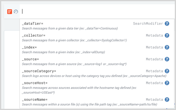 As you type, or when you press the space bar, search autocomplete offers the common AND and OR operators. Then after you type the first pipe (|) of your query, it suggests more advanced search operators, depending on what you type. The feature also includes links to documentation for search operators and other Sumo Logic features. Click the blue question mark icon to open the Help page on that topic for more information.