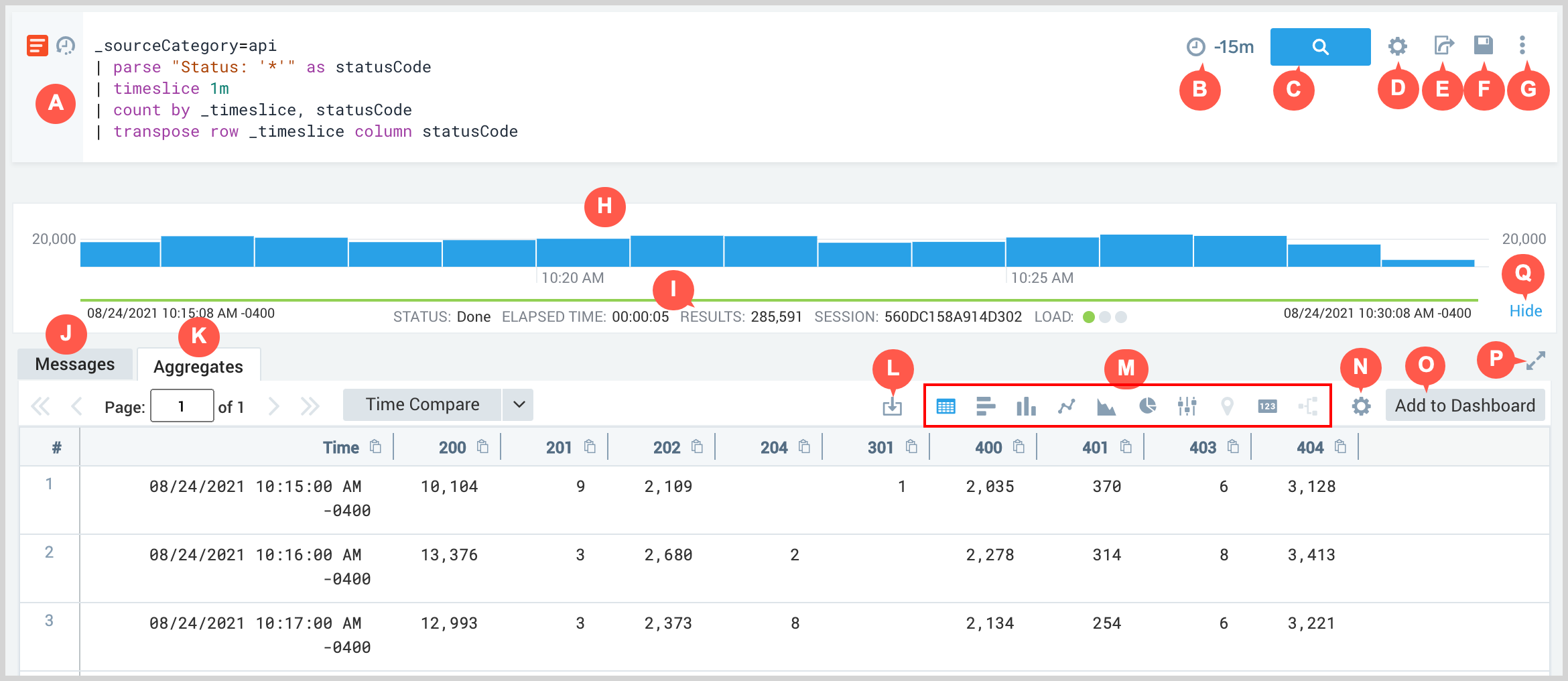| I | Search Details such as session, status, elapsed time, results, raw count, search expression, and load. When searching an Infrequent Partition the estimated and actual amount of data scanned is displayed. |