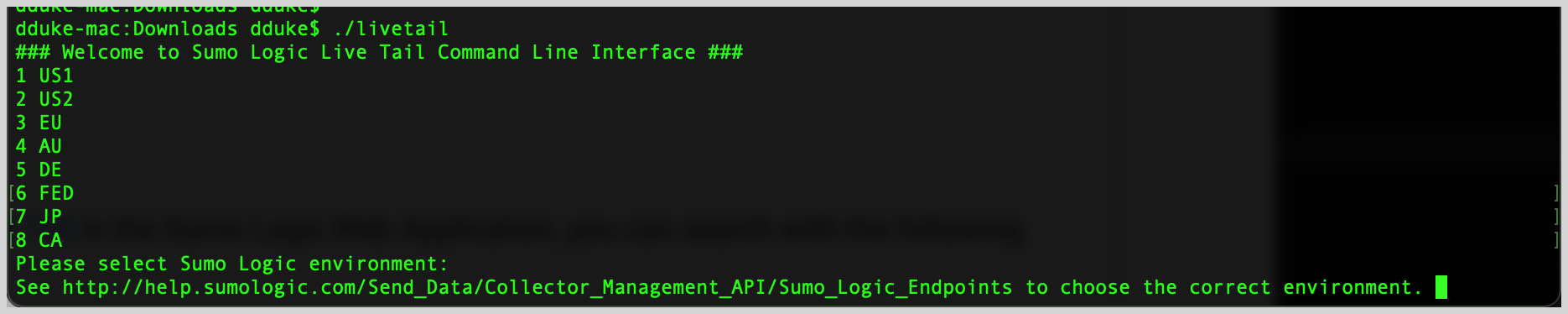 -h to view Help.-i to enter your Access ID.-k to enter your Access Key.-v to display the Live Tail CLI version number and exit.-c to clear your Access ID and Access Key.- Ctrl-C or Ctrl-D to stop your Live Tail session.