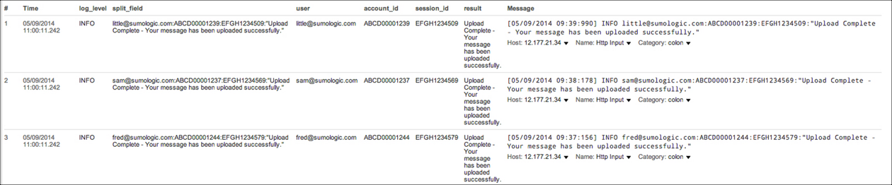 [05/09/2014 09:39:990] INFO little@sumologic.com:ABCD00001239:EFGH1234509: