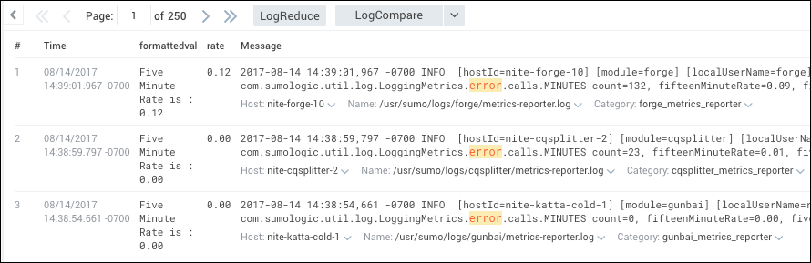 In this query, we search for errors, then parse the field “fiveMinuteRate” as “rate”, then combine the text “Five Minute Rate is :” and the rate together as “formattedVal”.