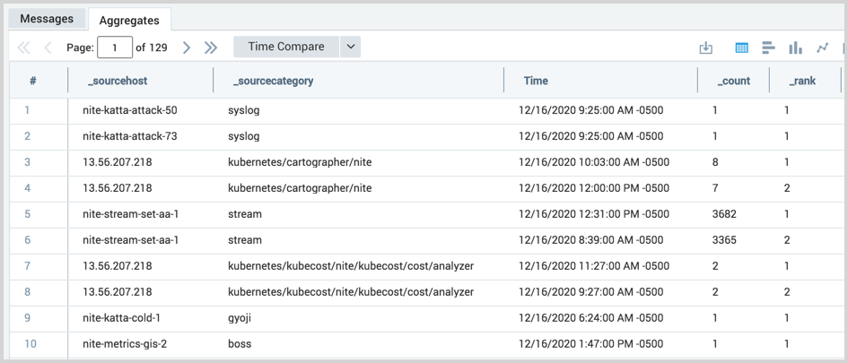 We can specify more than one argument to group by. In the query above, we are looking for the top 2 results for each source host, source Category pairs.