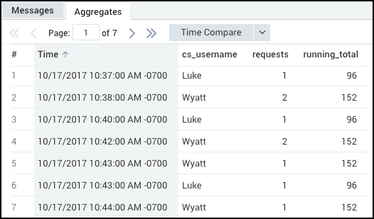 To group rows by their message time and calculate different totals for each time, use the _messageTime field: