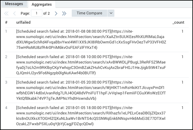 In the dashboard of failed scheduled searches, you can use the tourl operator to display the time when the scheduled searches failed and linking it to the search URL, instead of displaying the URL of the scheduled searches.